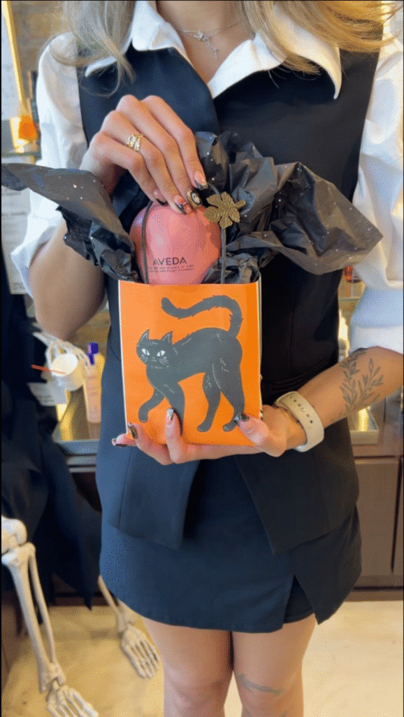 - Instagram-Worthy Packaging – Let’s be honest, Aveda’s sleek bottles and earthy tones fit perfectly with any Boo Basket’s spooky-chic vibe. Check out our abundant blow out bottle here.